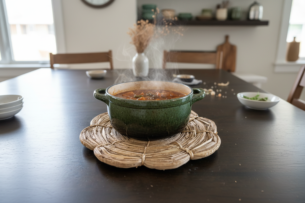 This handcrafted trivet is made from natural banana straw, carefully woven to protect your table and countertops from hot cookware while adding a warm, earthy touch to your kitchen or dining space.